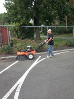 Crafco’s Hot Rubberized Crack Sealant that meets material requirements when tested in accordance with ASTM D6690. Cracks will be prepped using 90 cfm of forced HOT air at 2,800 degrees on an as needed basis. Also a motorized 8″ Steel Wire Brush Specifically designed to sweep through crevices for better prepared crack edges will be utilized on an as needed basis as well. This insures that the hot rubberized crack sealant will penetrate deep into the crack as well as etch the crack wall to ensure an excellent bond. Black beauty sand will be used to coat the crack band to inhibit sealer to stick & resist being tacky. Linear footage of the worst cracks is always written down on our estimates so the customer knows what they are getting for the money.